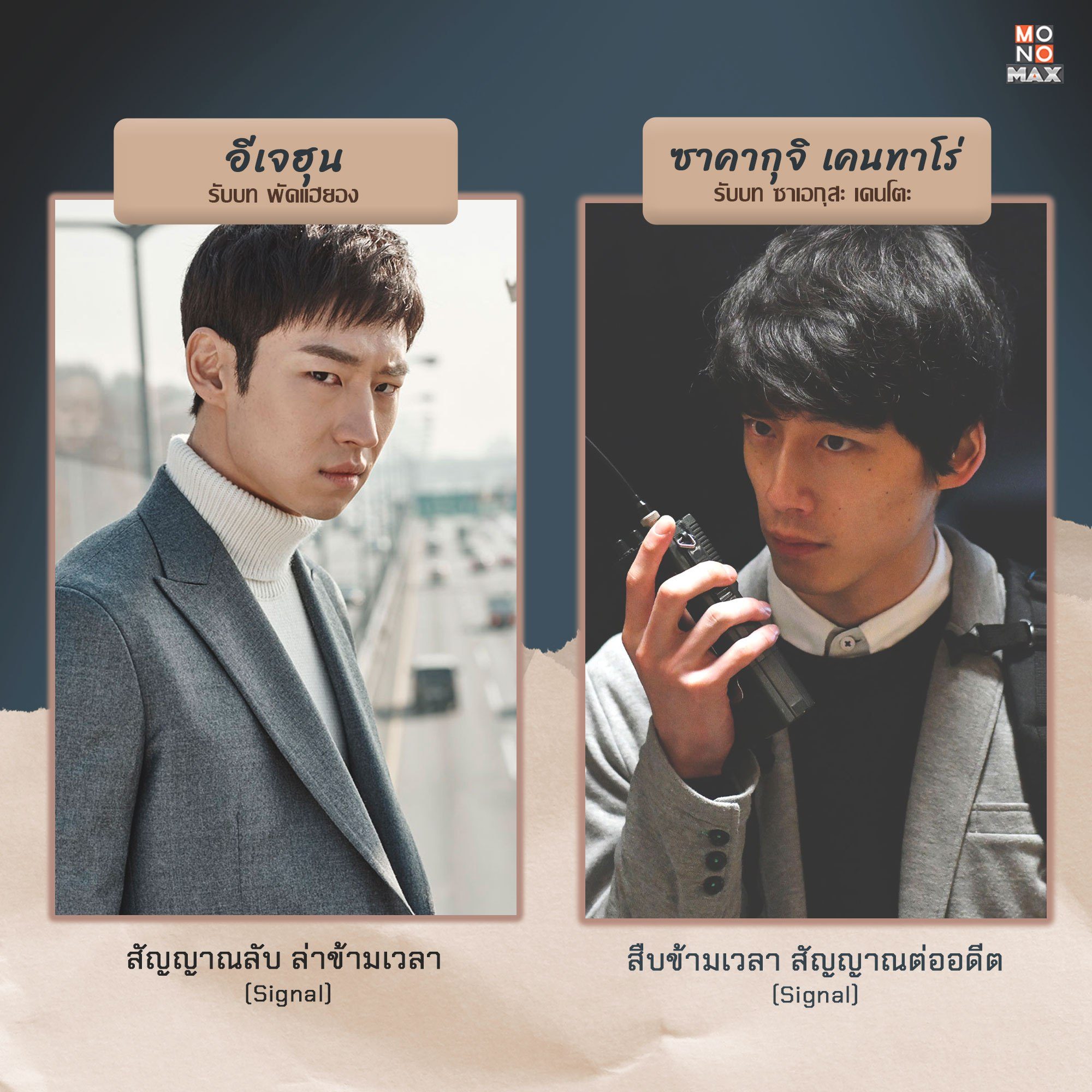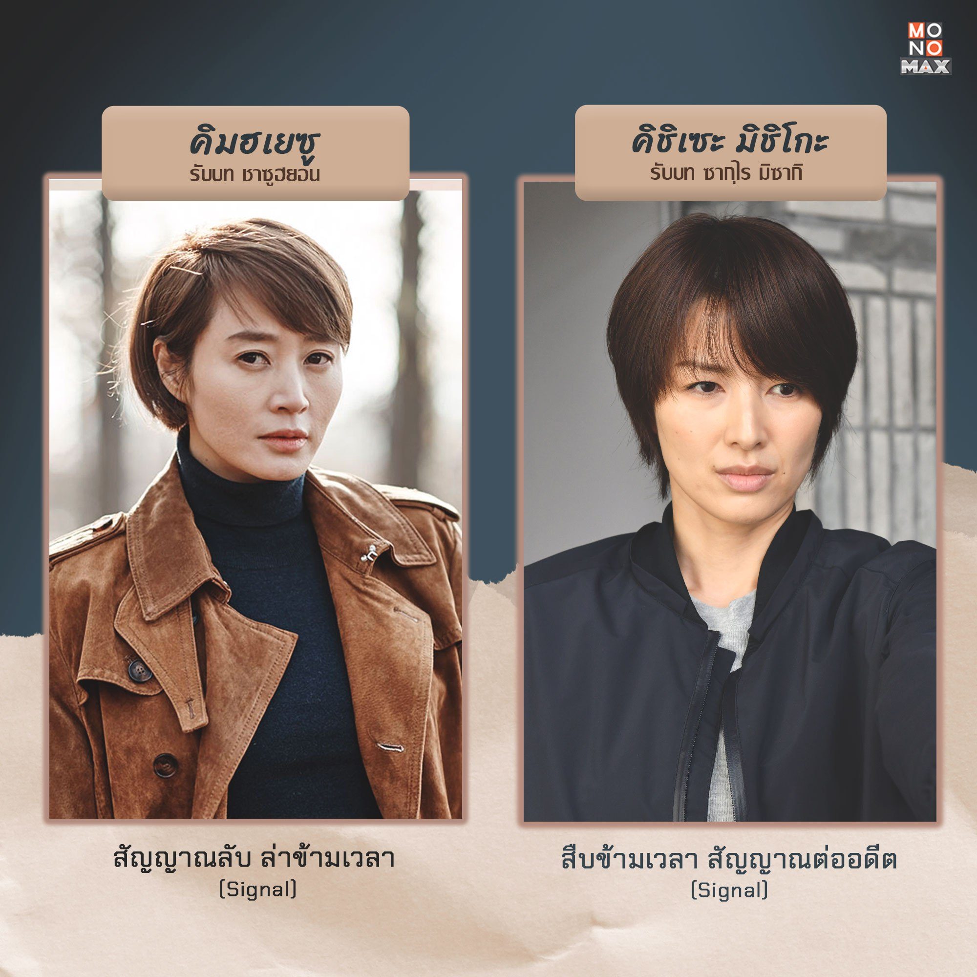 เมื่อ "Signal สืบข้ามเวลา สัญญาณต่ออดีต" ซีรีส์ญี่ปุ่นแนวแอ็กชัน-สืบสวนได้ถูกรีเมกมาจากซีรีส์เกาหลียอดนิยมในชื่อเดียวกัน "Signal สัญญาณลับ ล่าข้ามเวลา" เราจึงมาเปรียบเทียบนักแสดงทั้งสองเวอร์ชั่นให้ดูว่าแต่ละเวอร์ชั่นนั้น มีใครมาเป็นนักแสดงนำกันบ้าง สามารถรับชมซีรีส์ Signal ทั้งเวอร์ชั่นเกาหลีและญี่ปุ่นในแบบฉบับพากย์ไทย-ซับไทยได้ที่ MONOMAX