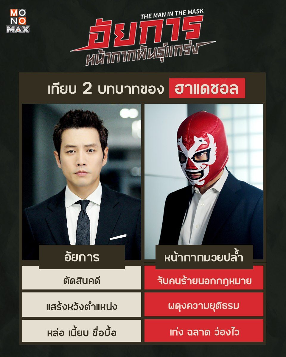 เทียบ 2 บทบาทของ ฮาแดชอล (รับบทโดย จูซังอุค) อัยการหนุ่มที่ตัดสินคดีด้วยความชอบธรรมในตอนกลางวัน และเป็น "หน้ากากมวยปล้ำ" เพื่อผดุงความยุติธรรมในตอนกลางคืน! ตามมาทำความรู้จักเขาให้มากขึ้นได้ใน ซีรีส์เกาหลี 'อัยการหน้ากากพันธุ์แกร่ง The Man in the Mask' พากย์ไทย-ซับไทยที่ MONOMAX