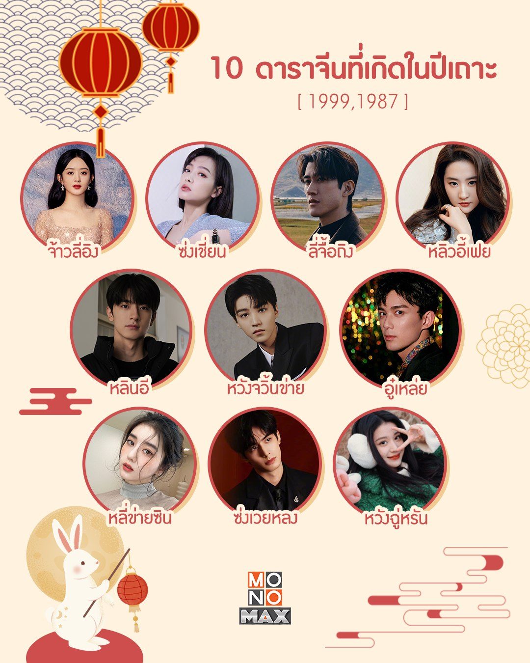 คนที่เกิดในปีกระต่าย มักจะเป็นคนที่มีไหวพริบดี ฉลาดเฉลียว มารยาทงาม เป็นที่รักของคนรอบข้าง โดยพวกเขาจะเกิดในปี 1975 (อายุครบ 48 ปี) 1987 (อายุครบ 36 ปี) 1999 (อายุครบ 24 ปี) 2011 (อายุครบ 12 ปี) และวันนี้ MONOMAX ได้รวบรวม 10 ดาราจีนที่เกิดในปีเถาะ พร้อมผลงานของพวกเขามาให้แฟน ๆ ได้สนุกเต็มอิ่มตลอดปีกระต่ายนี้