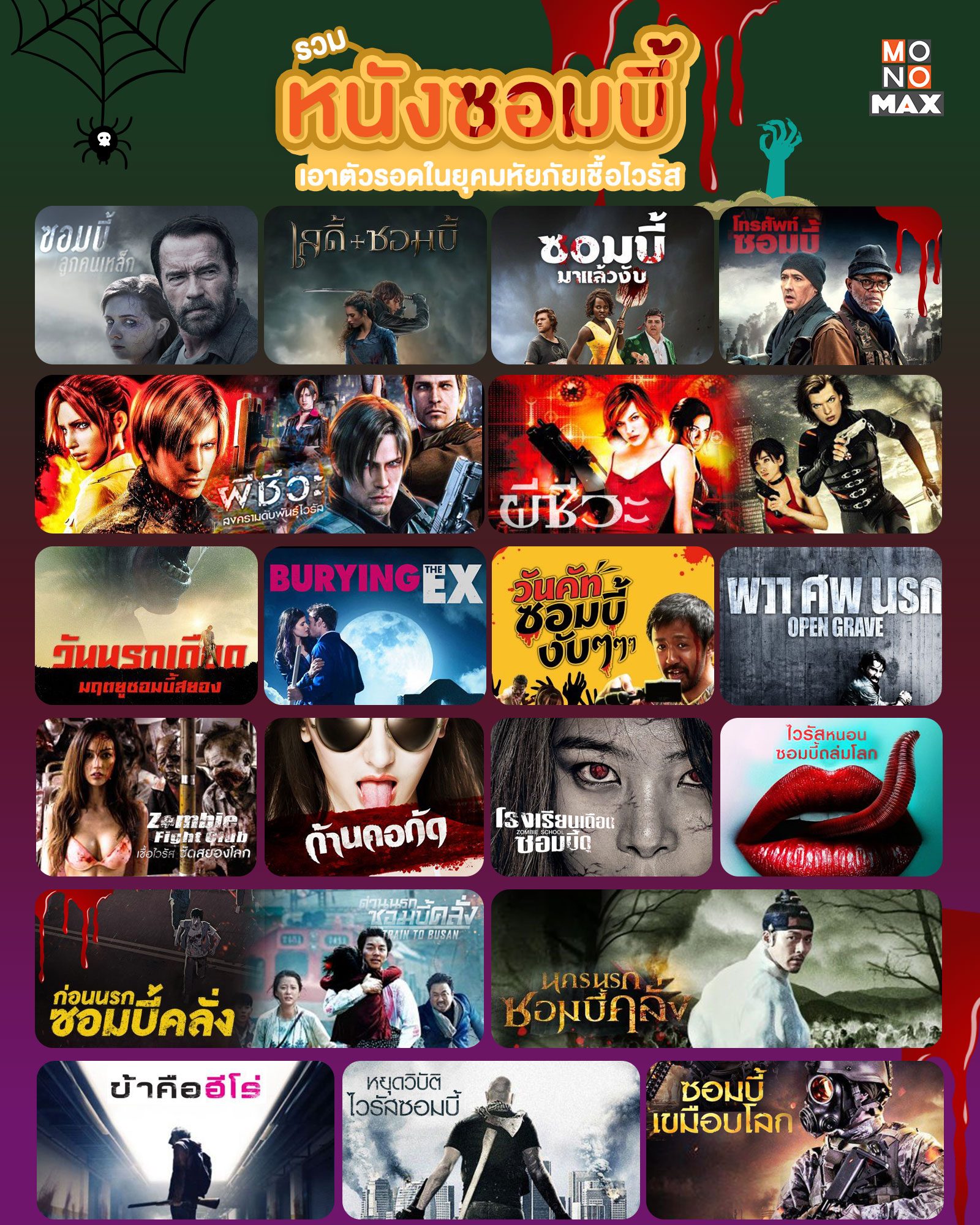 จะมีครั้งไหนที่มวลมนุษย์ชาติเข้าใกล้สถานการณ์วิกฤตได้เท่าครั้งนี้ มาหนีตายจากเหล่าซอมบี้กระหายเลือด, เชื้อไวรัสกลายพันธุ์ แล้วมีชีวิตรอดถึงปี 2022 ไปด้วยกัน เตรียมพร้อมรับมือภัยร้ายกระหายเลือดครั้งนี้ด้วยขบวนหนังซอมบี้ที่ MONOMAX จัดให้ เปิดวาร์ปคลังภาพยนตร์ซอมบี้เรื่องดังกว่า 20 เรื่อง ให้ทุกคนไปสัมผัสความสนุกผสมความสยอง ปลุกความสตรองในตัวคุณ
