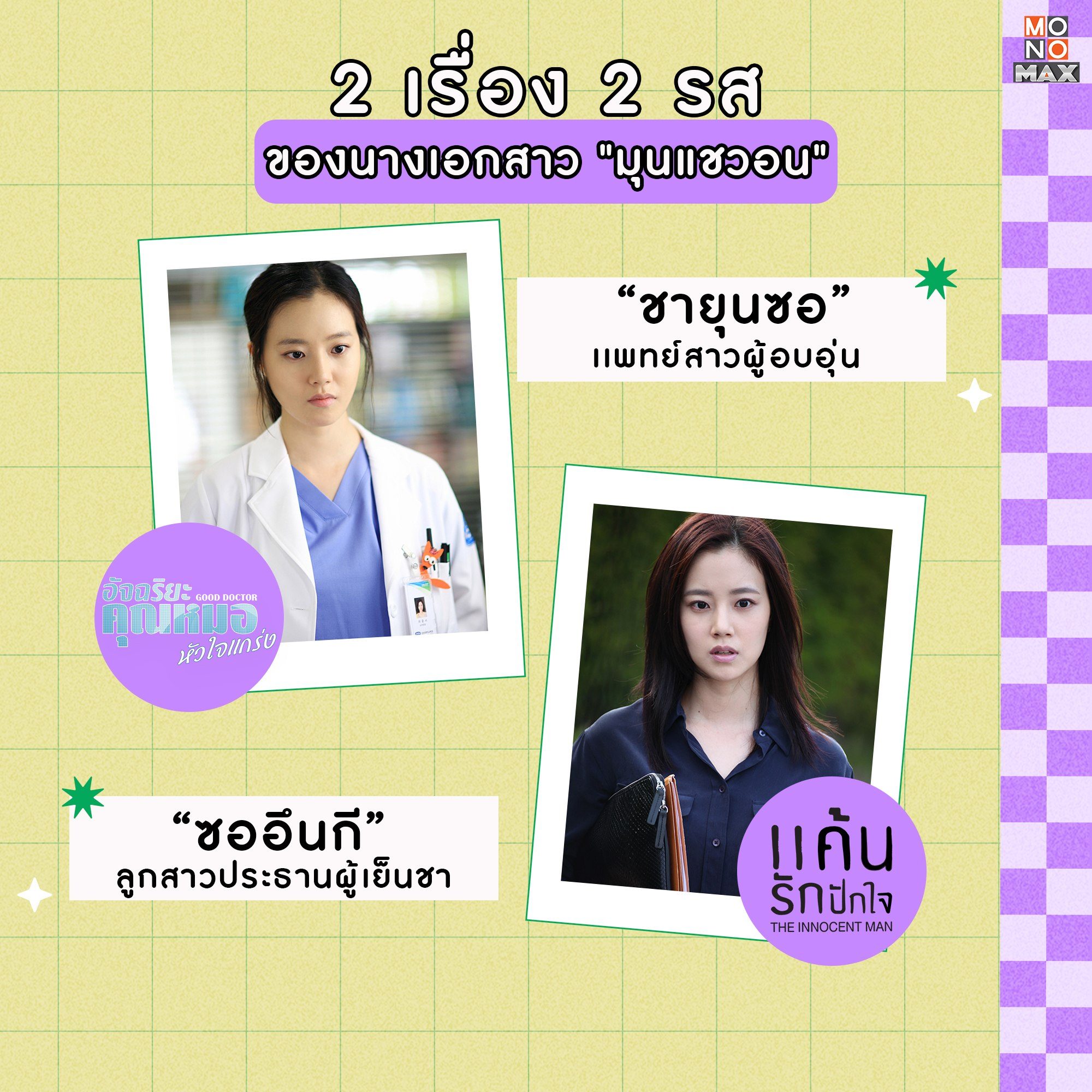 "มุนแชวอน" นางเอกสาวที่มีผลงานการเเสดงน่าจับตามองมากมาย วันนี้เราจึงถือโอกาสหยิบยกผลงานอันโดดเด่นอย่าง "อัจฉริยะคุณหมอหัวใจแกร่ง Good Doctor" ซีรีส์เเนววงการแพทย์กับบทบาท 'ชายุนซอ' เเพทย์หญิงผู้อบอุ่น และซีรีส์ "แค้นรักปักใจ The Innocent Man" ซีรีส์เเนวล้างเเค้นกับบทบาท 'ซออึนกี' ลูกสาวประธานผู้เเสนเย็นชา ติดตามรับชมผลงานการเเสดงทั้ง 2 เรื่องของเธอแบบฉบับพากย์ไทย-ซับไทย ได้ที่ MONOMAX