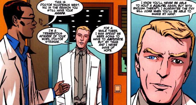นายแพทย์ที่ผ่าตัดมือของสตีเฟ่นก็คือ นิโคเดมัส เวสต์ หรือ นิค เวสต์ (คนในรูปล่าง) นั่นเอง ซึ่งในภาพยนตร์ก็รับบทโดย ไมเคิล สตูห์ลบาร์ก แต่ในเวอร์ชั่นคอมิคตัวละครตัวนี้จะโดดเด่นเป็นพิเศษโดยเฉพาะใน The Oath (2007) ที่มีอิทธิพลกับหนังเรื่องนี้อย่างยิ่ง โดยในคอมิค นิค เวสต์ จะตามสเตรนจ์ไปคามาร์ทาจและฝึกภายใต้การดูแลของแอนเชี่ยนวัน ก่อนจะออกสำนักก่อนนำหนด