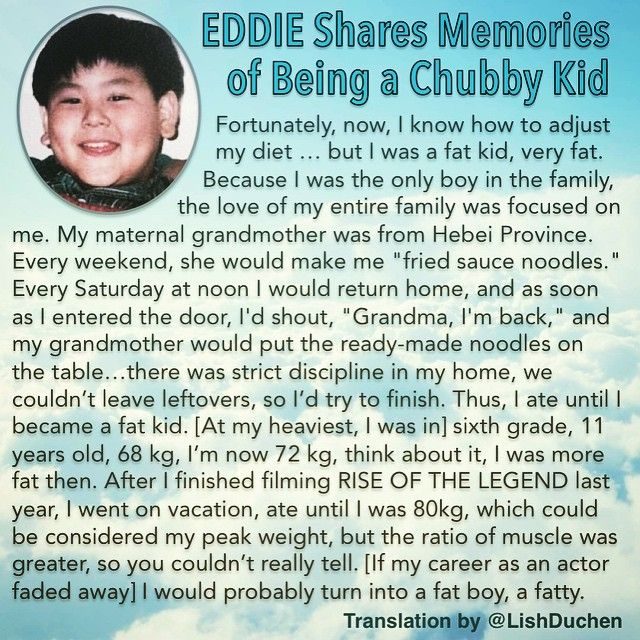 1. ไม่น่าเชื่อว่าเด็กอ้วนในอดีตจะกลายเป็นหนุ่มหล่อสุดแฮนซัมในวันนี้ เอ็ดดี้ เผิงเล่าว่า ตอนอายุ 11 เขาเป็นเด็กที่อ้วนมากๆ เพราะคุณยายที่เลี้ยงดูอย่างดี มักจะทำก๋วยเตี๋ยวผัดราดซอสไว้ให้เขาทาน และเคย หนักถึง 68 กิโลกรัม แต่นั่นทำให้เขาได้เล่นโฆษณาขนมของว่างอยู่บ่อยๆ เคยแสดงโฆษณาขนมเด็กกว่า 10 ชิ้น เรียกว่าเป็น 'King of Snake'เลยทีเดียว