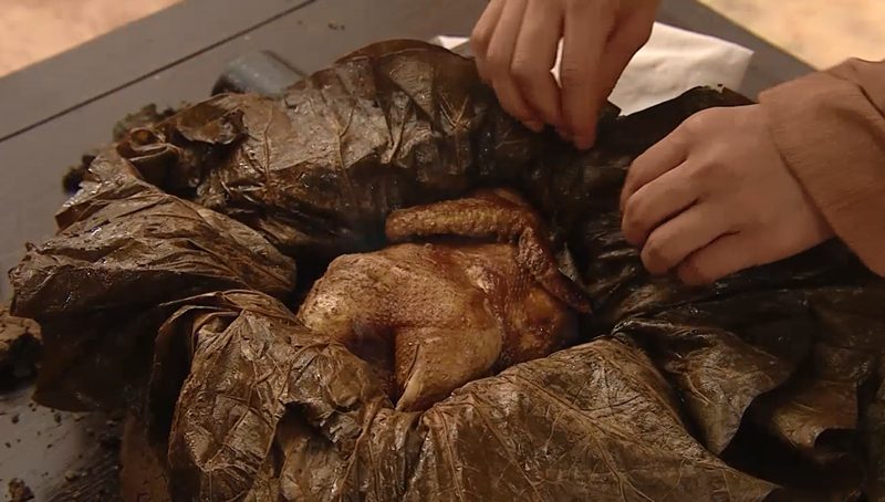 นำไก่ทั้งตัวมาคลุกโคลน แล้วนำไปอบในฟืนไฟ หลังจากสุกแล้วก็เคาะโคลนให้แตก ขนไก่จะหลุดไปพร้อมกับโคลน กลายเป็นอาหารเลิศรสที่ชื่อว่าไก่ขอทาน