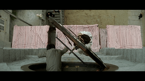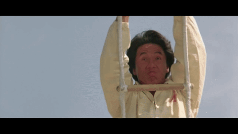 จากภาพยนตร์แอคชั่นคอมเมดี้เรื่อง เอไกหว่า หรือ A Project ในปี 1983 ฉากนี้เฉินหลงไปทำการห้อยตัวอยู่บนหอคอยนาฬิกาความสูงประมาณ 4 ชั้น โดยใช้มือทั้งสองข้างจับเข็มนาฬิกาเอาไว้ ก่อนจะปล่อยมือออกและตกลงใส่ผ้าใบที่ยื่นออกมาเป็นกันสาด 2 ครั้ง ซึ่งตอนตกลงมาตัวเฉินหลงได้พลิกจนต้องใช้คอลงแต่โชคดีที่มือยังกั้นไว้ทัน เท่านั้นไม่พอเฉินหลงยังสามารถทำการแสดงได้ต่อแบบไม่ต้องสั่งคัทอีกด้วย