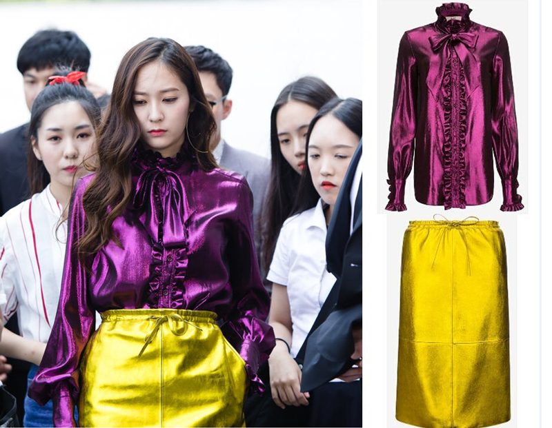 2.ชุดสวยแซ่บสะดุดตาด้วยสีสันที่ตัดกันแบบแสบๆ ด้วยเสื้อคลุมแขนยาาวสีม่วงมีโบว์และระบาย เข้าคู่กับกระโปรงสีเหลืองเมทาลิค รุ่น Bally Metallic Nappa Leather Skirt in Lemon ราคา 1,695 เหรียญ ได้ทั้งลุคสาวสุดมั่นและชิคไปในเวลาเดียวกัน
