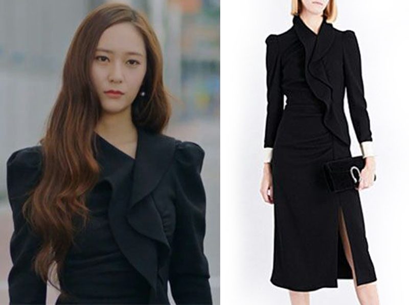 4.เดรสสีดำเน้นความเรียบหรูและดูเป็นผู้ดีสุดๆ จากแบรนด์ GUCCI : Ruffle-Trimmed Grain De Poudre Wool dress ราคา 3,400 เหรียญ