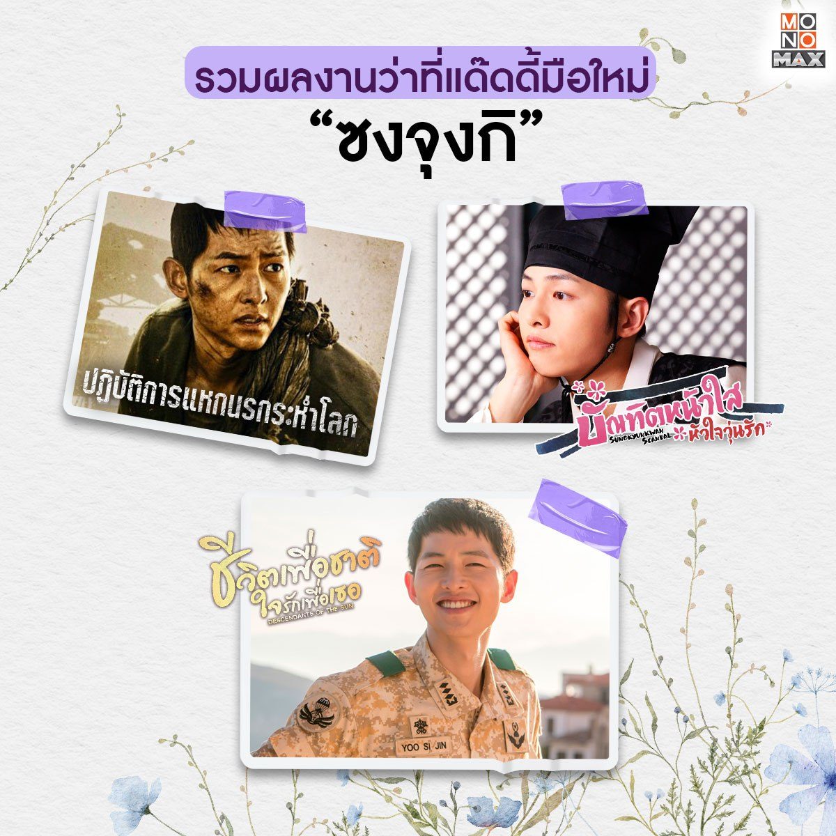 ขอแสดงความยินดีกับพระเอกหนุ่มมากความสามารถ "ซงจุงกิ" ที่ประกาศแต่งงานกับแฟนสาวชาวต่างชาติ "Katy Louise Saunders" อีกทั้งยังแจ้งข่าวดีให้แฟนๆ ได้ทราบโดยทั่วกันว่าเขากำลังจะมี 'จุงกิน้อย' ที่จะมาเป็นโซ่ทองคล้องใจเขากับภรรยา พวกเราชาว MONOMAX ยินดีด้วยมากๆ วันนี้เราจึงรวบรวมผลงานของคุณพ่อมือใหม่ป้ายแดงมาให้ทุกคนได้เลือกชมกัน ตามมาสนับสนุนแด๊ดดี้(ที่แปลว่าพ่อจริงๆ) ได้ในแบบฉบับพากย์ไทย-ซับไทยทุกเรื่องที่ MONOMAX