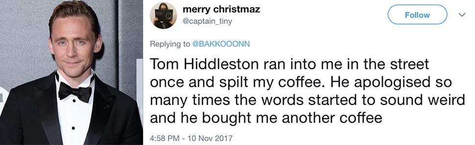 มีแอ็กเคานต์ทวิตเตอร์ชื่อว่า @captain_tiny ที่เคยเจอดาราชื่อดังอย่าง ทอม ฮิดเดิลสตัน เลยมีเรื่องราวน่ารักๆ ของเขามาเล่าให้ฟังว่า เกิดอุบัติเหตุ พี่ทอมวิ่งชนและทำให้กาแฟเธอหก แต่เขาก็รีบขอโทษเธอหลายต่อหลายครั้งอย่างสุภาพ และซื้อกาแฟแก้วใหม่ให้ด้วย