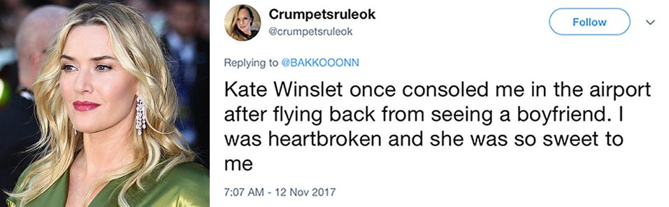 มีเรื่องเหลือเชื่อที่สาวคนหนึ่งกำลังเศร้าเพราะต้องบอกลาแฟนหนุ่มที่สนามบิน แต่อยู่ๆก็มีนางเอกสาวนักแสดงไททานิค อย่าง เคต วิน สเลท มานั่งเป็นเพื่อนและปลอบใจเธออยู่นานเลยทีเดียว