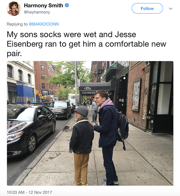 เจสซี ไอเซนเบิร์ก นักแสดงจาก The Social Network และ Now You See Me เขาเจอเด็กน้อยคนหนึ่งที่ถุงเท้าเปียก เลยช่วยโดยการวิ่งไปหาซื้อถุงเท้าคู่ใหม่ให้