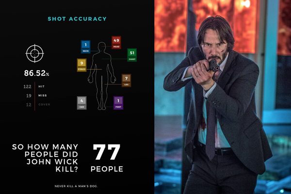 2. สถิติของสุดยอดนักฆ่าแห่งโลกมืด เปิดตัวภาคแรกก็จัดการไป 77 ศพ ส่วนในภาค 2 เขาจัดการเหล่านักฆ่ามืออาชีพไปทั้งสิ้น 128 คน เพิ่มจากภาค 1 ถึง 66.2% ส่วนภาค 3 ผู้กำกับแชด สตาเฮลสกี เผยมาว่ามันไม่สำคัญว่าจะมีคนตายกี่คน แต่เขาต้องการสร้างเรื่องราวให้เข้มข้นกว่า 2 ภาคที่ผ่านมามากกว่า