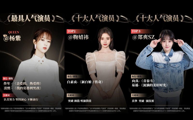 เริ่มต้นกันด้วยผลความนิยมทางฝั่งนักแสดงหญิง ในปี 2019 ที่ผ่านมาจากซีรีส์จีนสุดฮิต Go Go Squid! ทำให้ชื่อของสาวนักแสดงหยางจื่อ มาแรงจนติดอันดับหนึ่ง!! ตามมาด้วย จูจิงอี้ สาววัยใสที่เต็มไปด้วยความสดใสน่ารักครองตำแหน่งอันดับสอง และที่สามตกเป็นของเจิ้งส่วง นักแสดงสาวจากซีรีส์เวยเวย เธอยิ้มโลกละลาย